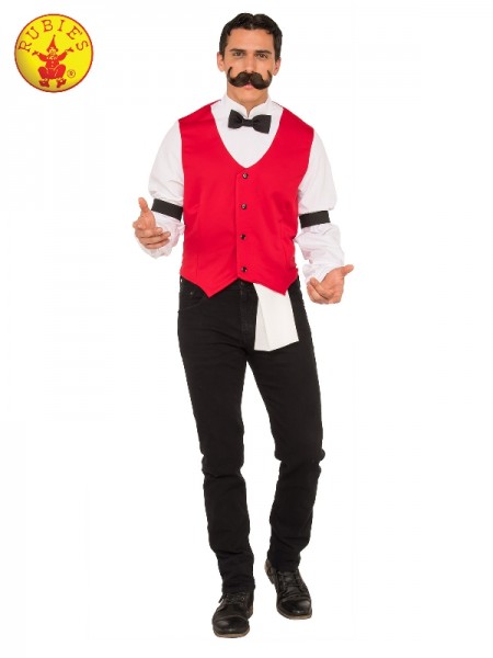 Pour a pint of lager as a barman - or maybe spin a cocktail shaker with ease and style. The threads, the facial hair and the pinstripes say it all. So why not get behind the bar in these savvy strides? INCLUDES: Shirt with attached red vest and buttons in front Two black elastic armbands and fabric bow tie on elastic strap Faux moustache made from polypropylene hair strands and face friendly glue to attach plus cleaning cloth to hang from pants Pants and shoes not included