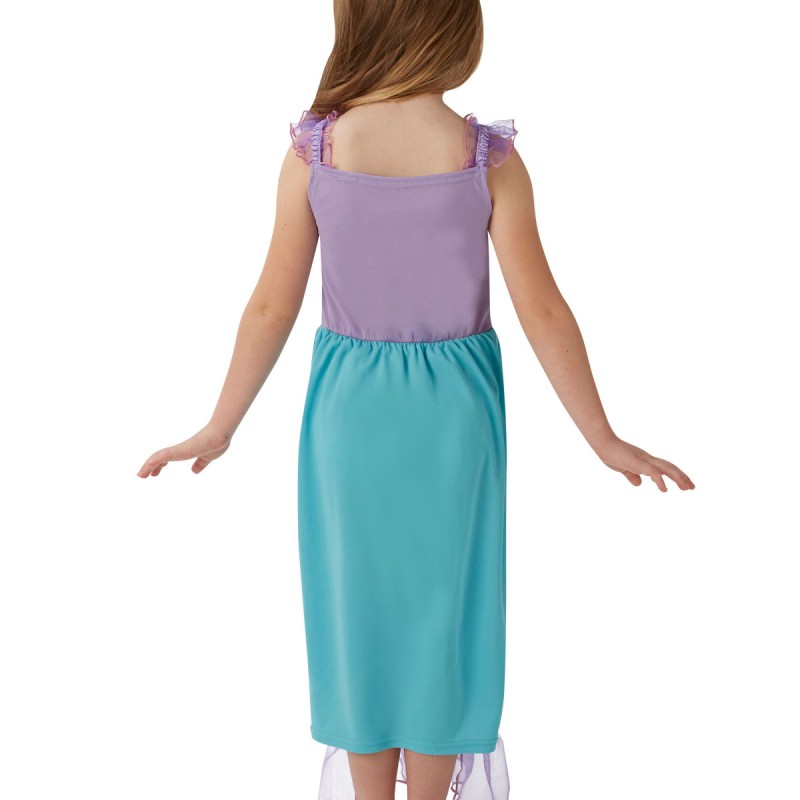 Dress with purple satin bodice featuring printed character pendant in centre and printed sequin design