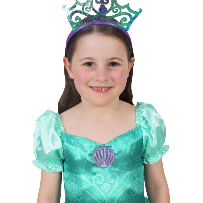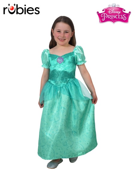 Includes: Dress with satin bodice featuring attached purple clamshell and beautiful puff sleevelets and tulle peplum at waistline Dress features printed under water images of flounder and Scuttle as well as sea reeds and bubbles Velcro tabs for closure at rear Shoes not included This is an officially licensed Disney product