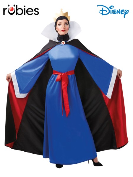 Includes Purple polyester long dress with draped sleeves and white and gold trim at cuffs Long red waist sash Black cloak with satin finish and firm moulded white collar plus clasp with red faux jewel Black fabric snood has attached foam crown featuring glitter gold trim at edges This is an officially licensed Disney product